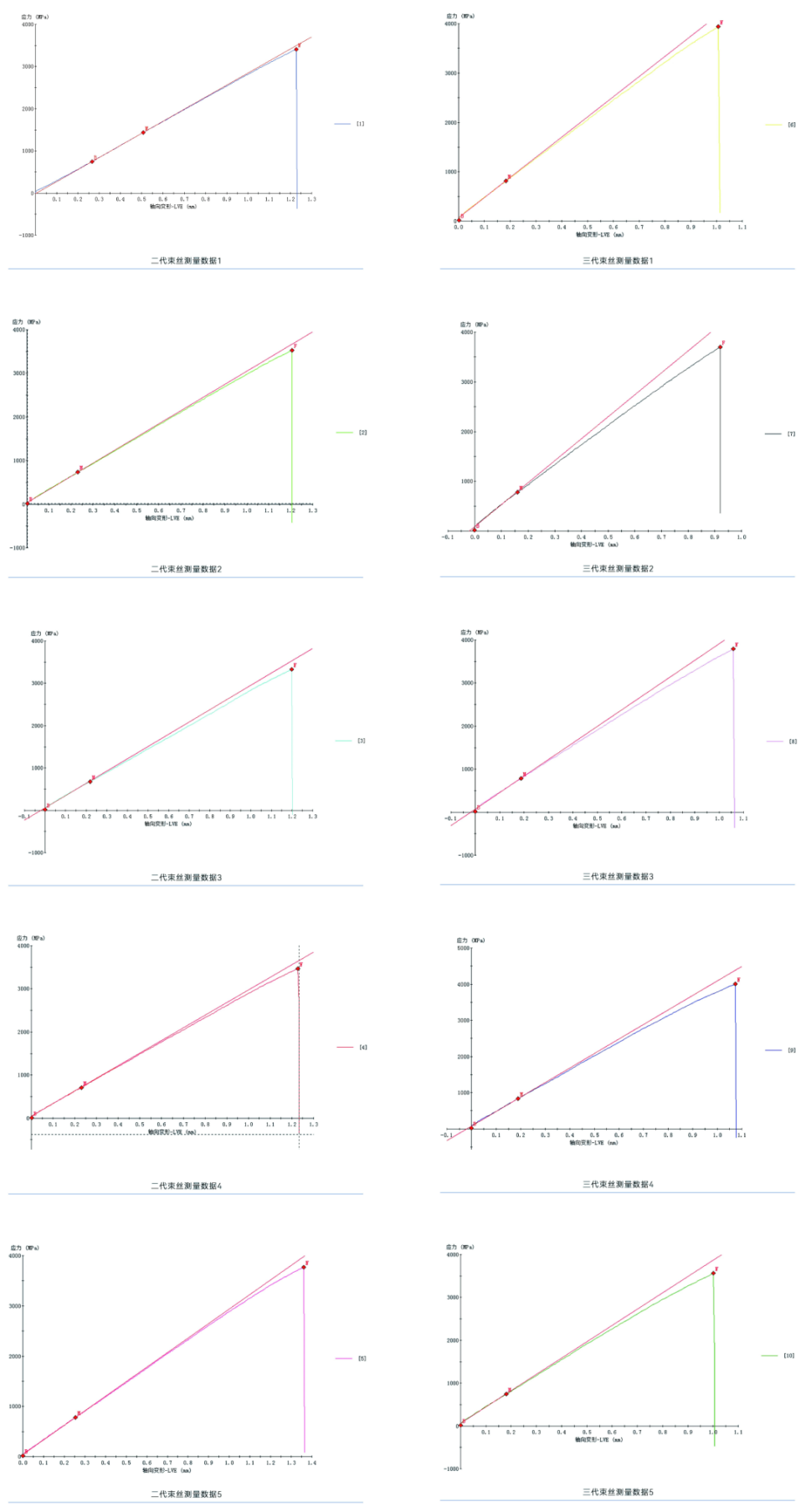 二代碳纤维复丝、三代碳纤维复丝共十组曲线平滑,无异常跳动数据。